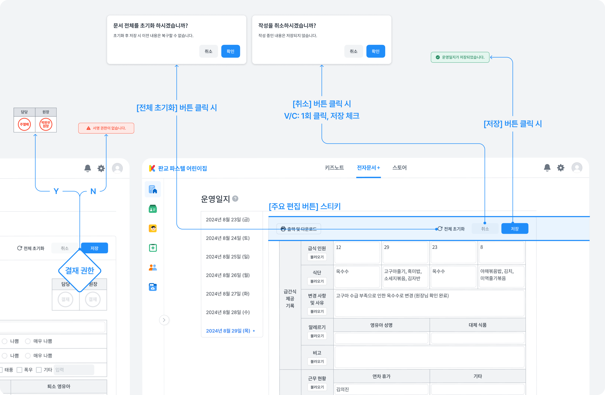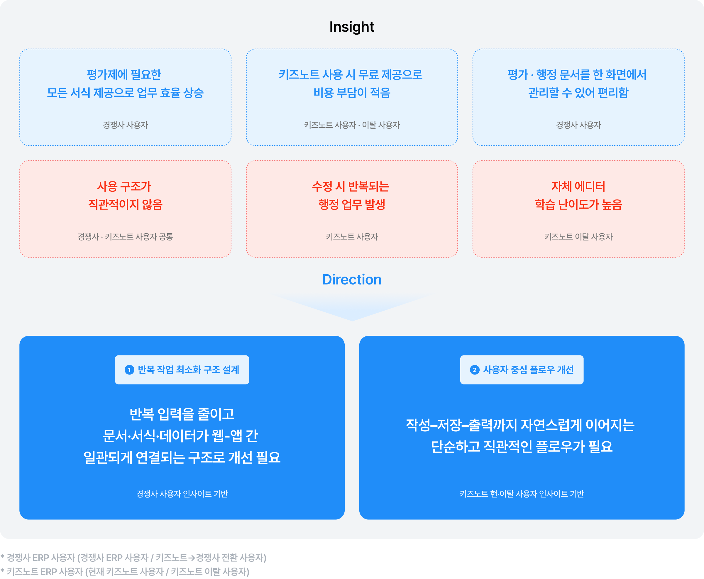 실제 화면을 직접 사용하며 불편이 반복되는 이유를 분석했어요. 일부 기능은 존재했지만, 실제 업무 환경과 맞지 않아 에디터를 사용하기 위해 추가로 학습해야 하는 상황이었어요. 또한, 데이터가 연동되지 않아 키즈노트 앱에서 입력한 정보를 ERP에서 다시 작성해야 했고, 작성–저장–출력 과정이 분리되어 있어 사용자의 탐색 과정이 불필요하게 길어지고 있었어요.