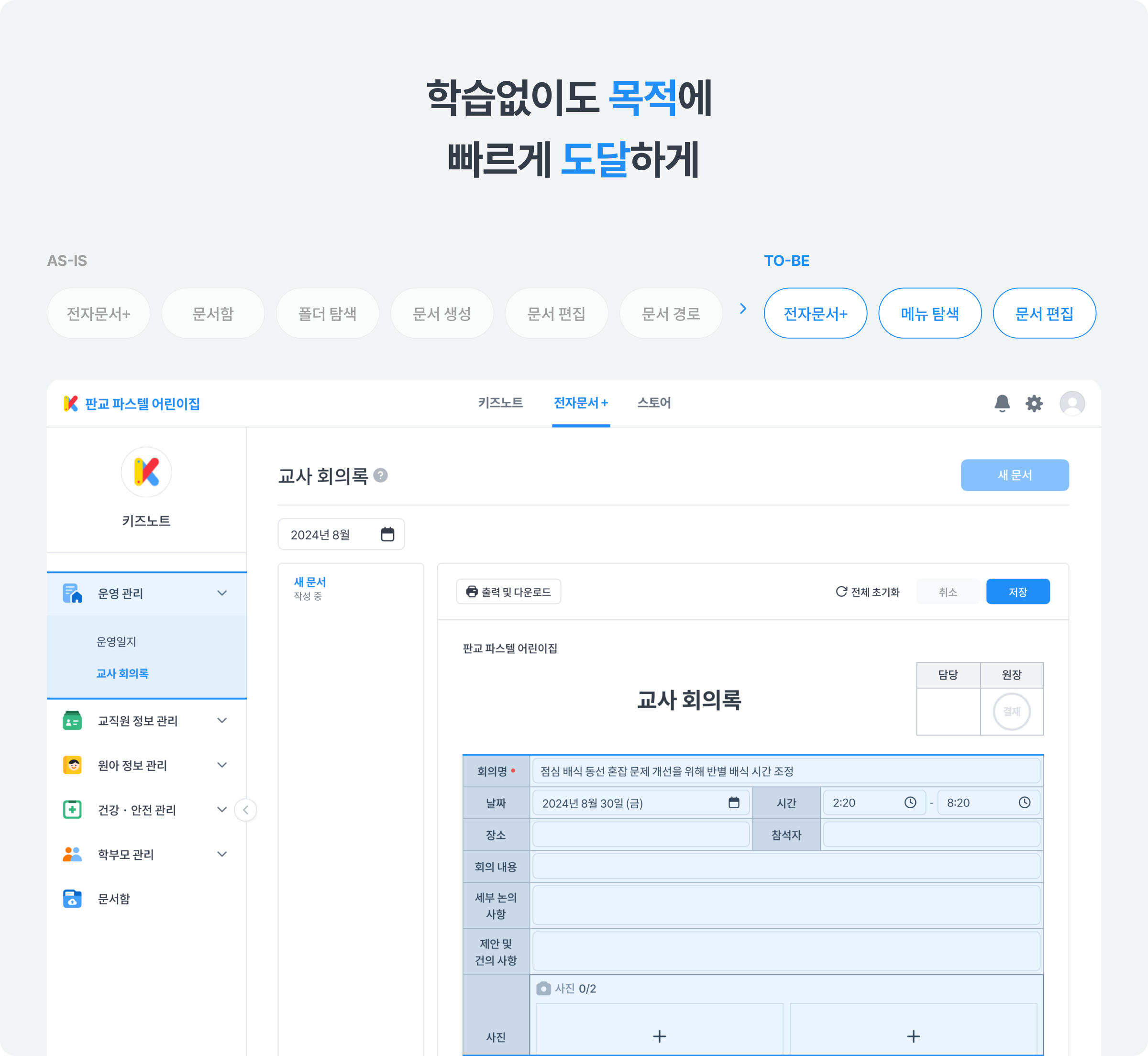 이전까지는 한정된 기능으로 별도 프로그램 사용하거나 키즈노트에서 제공되는 문서함 에디터를 통해 수기로 입력해야 했던 불편함이 반복되었어요. 개선된 키즈노트 전자문서+는 키즈노트 앱에서 작성한 모든 정보를 언제든 PC 서류 작성 과정에서 불러올 수 있어 간편하고 빠르게 작성할 수 있게 되었어요.
