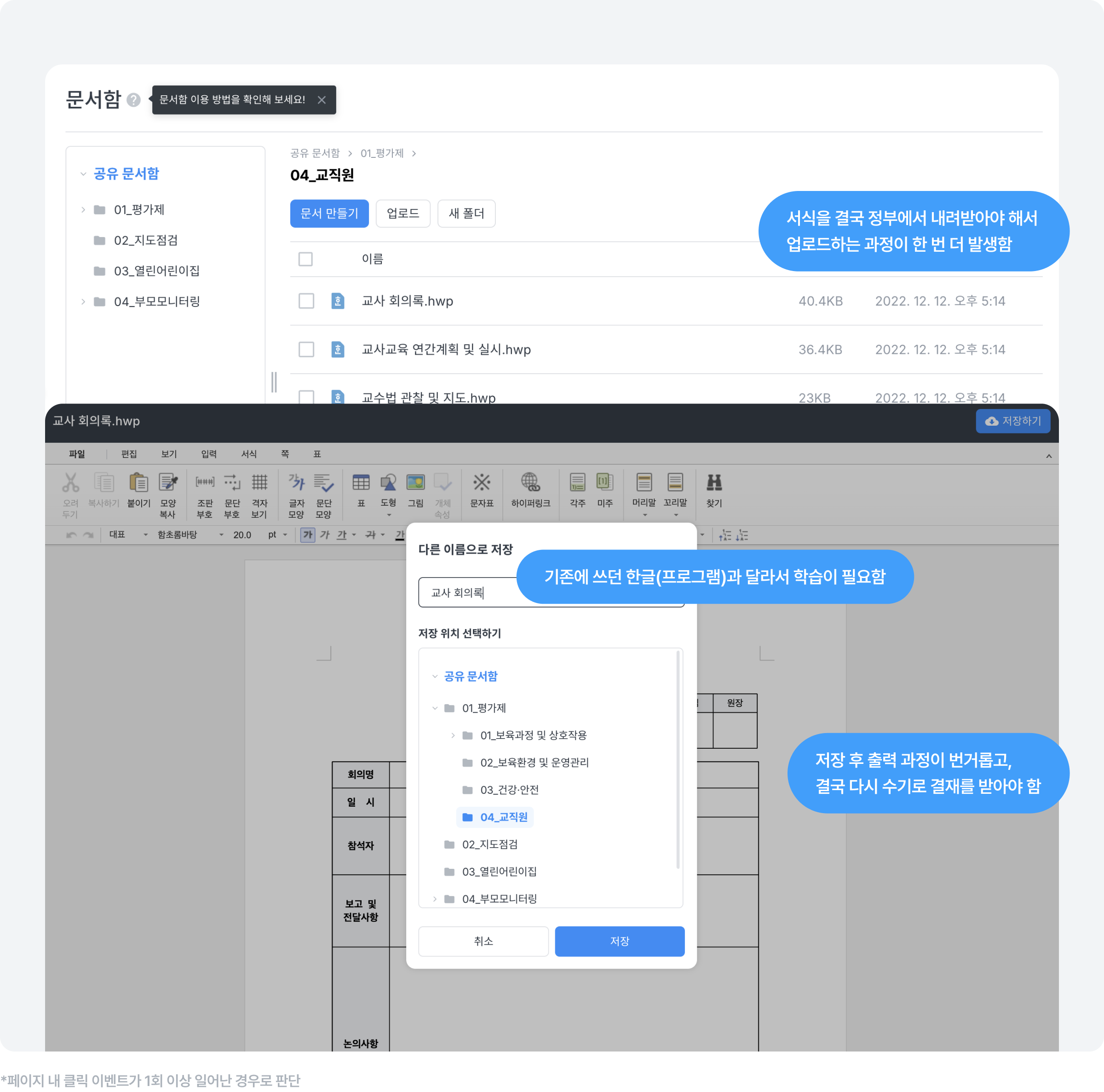 기존의 문서함은 이미 학습된 사용자의 사용성를 고려해 유지하며, 실제 평가제에 필요한 행정 서류들은 별도의 학습이나, 편집 프로그램 없이 편집, 수정할 수 있도록 업무 효율성 증대를 기반으로 개선했어요.